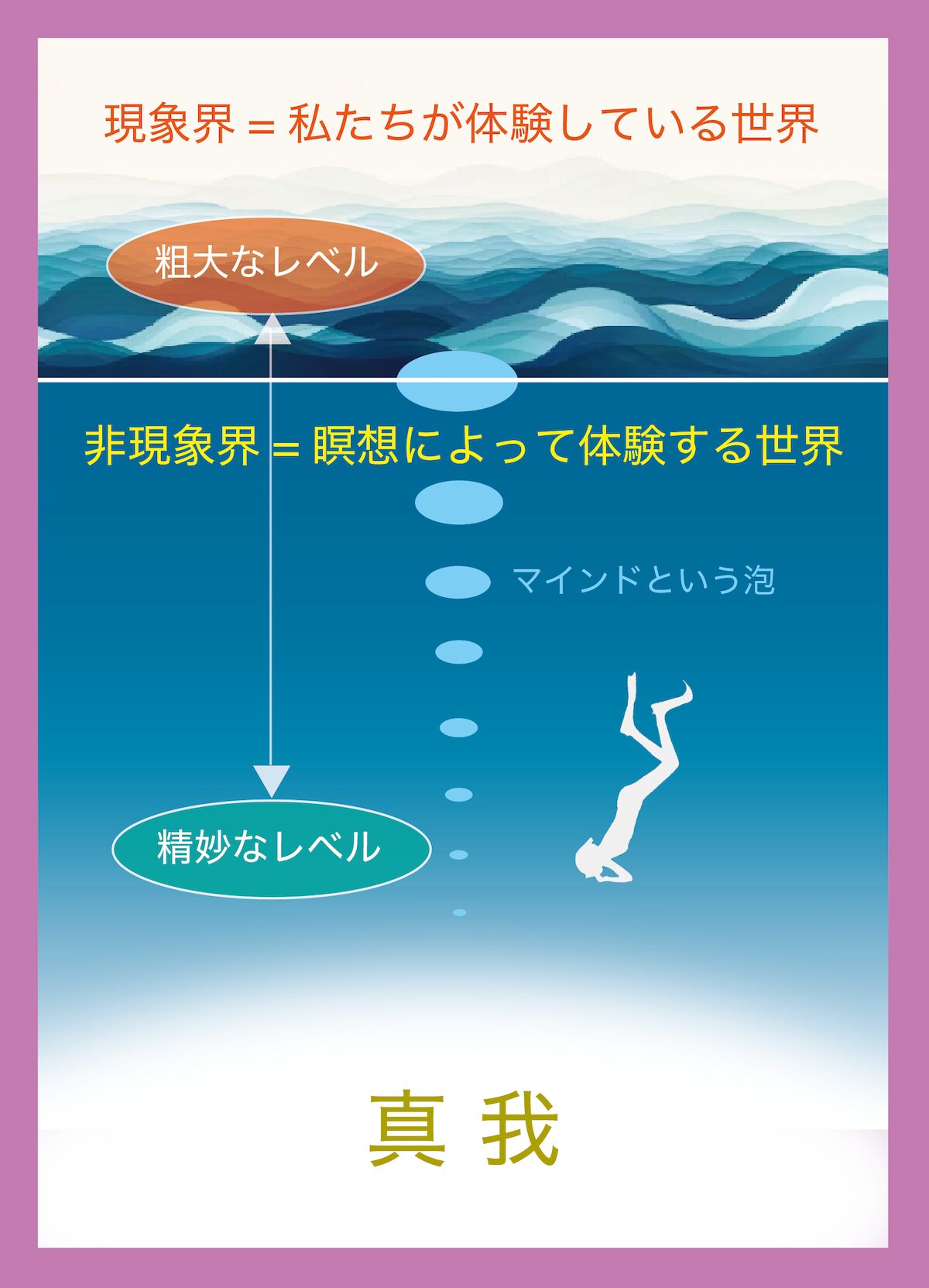 瞑想は私たちが生きている最も粗大な現象界から、自分の内側にある最も精妙レベルの純粋意識「真我」に向かって降りていく体験です。