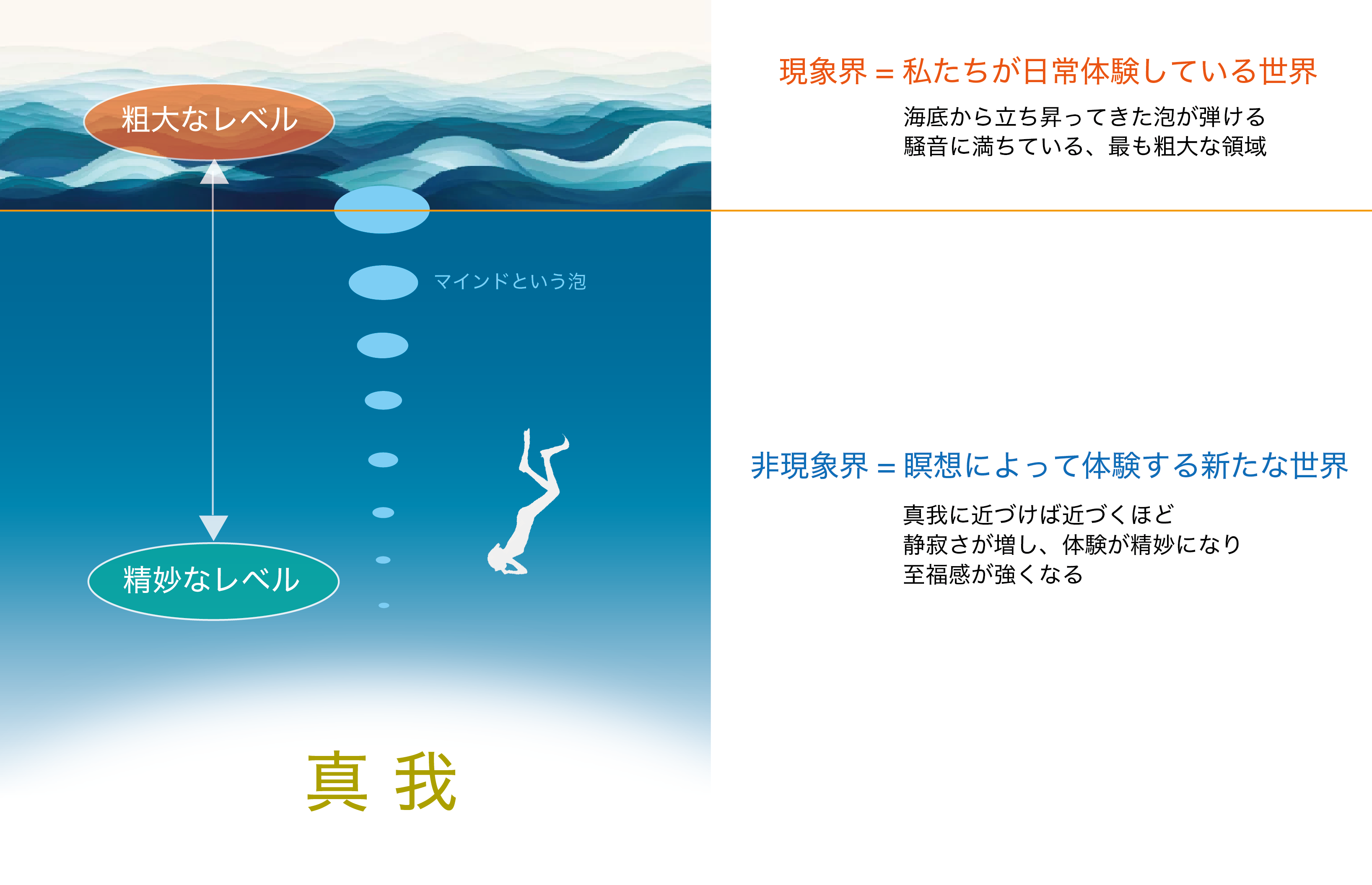 瞑想は私たちが生きている最も粗大な現象界から、自分の内側にある最も精妙レベルの純粋意識「真我」に向かって降りていく体験です。